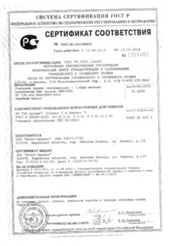 • заводской деактив оружейного завода Молот с паспортом и сертификатом