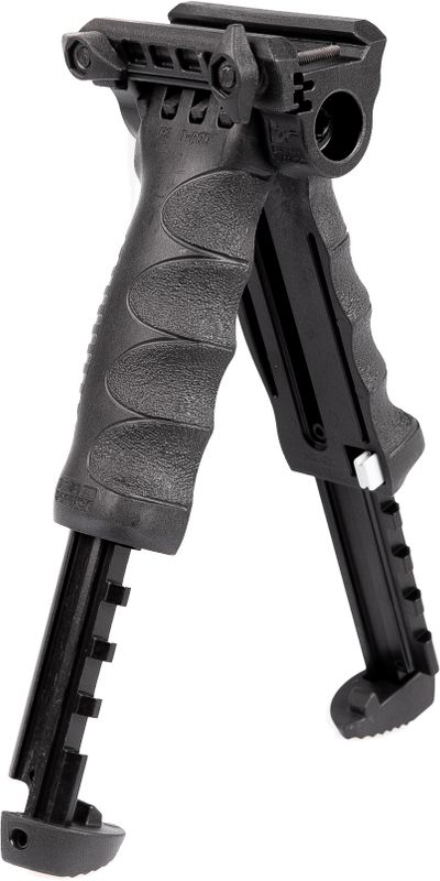 Трансформируется из передней рукоятки в полностью функциональные сошки нажатием одной кнопки.