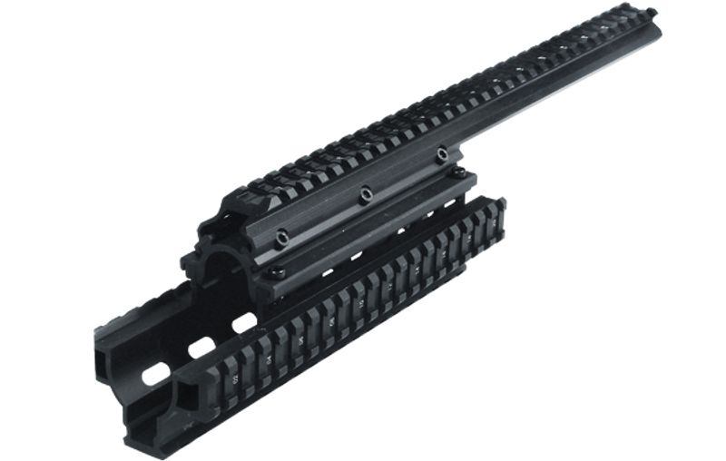 Кронштейн LEAPERS Saiga-12 Tactical Quad Rail популярная модель цевье разработанная специально для установки на гладкоствольное оружие марки Сайга 12-ого и 20-ого калибра. Также при невнесении небольших изменений в конструкцию станет возможной установка крепления практически на все модели оружия на базе АК. Кронштейн состоит из 4-х частей на каждой из которой расположена планка WEAVER/ Picatinny позволяющая установить оптический и коллиматорный прицел, а также различное дополнительное оборудование, например, ЛЦУ, фонарь и многого другого.