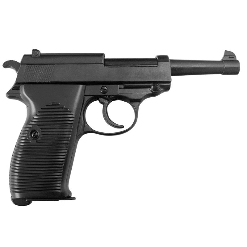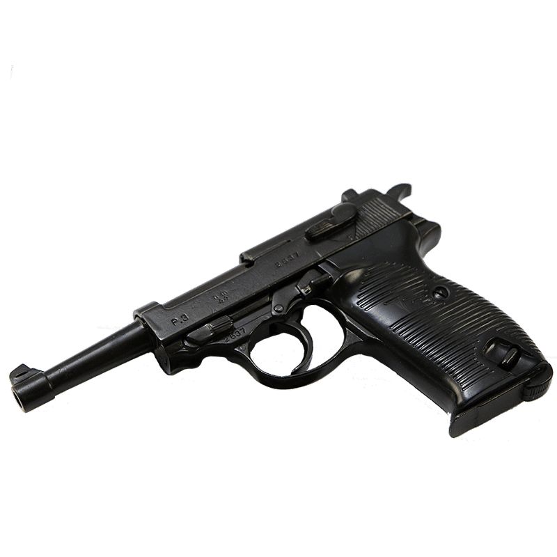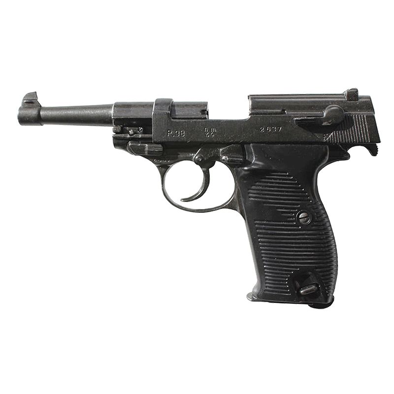 Бюджетный простой макет пистолета Вальтер Р38 производства компании Denix, Испания. Масса 705 грамм, габариты соответствуют оригиналу. Взводится затвор и курок, курок щелкает по нажатию на спусковой крючок.