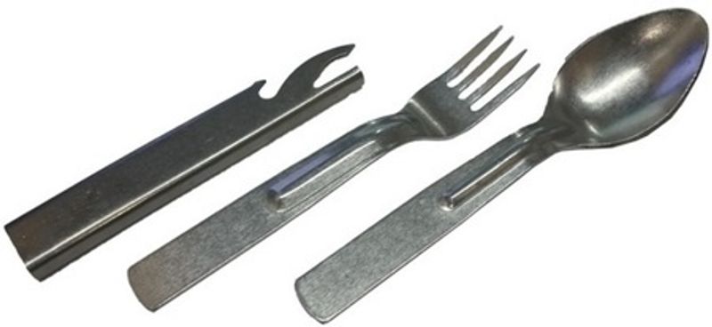 Вилка и ложка выполнены из пищевого алюминия, открывалка с консервным ножом из нержавеющей стали