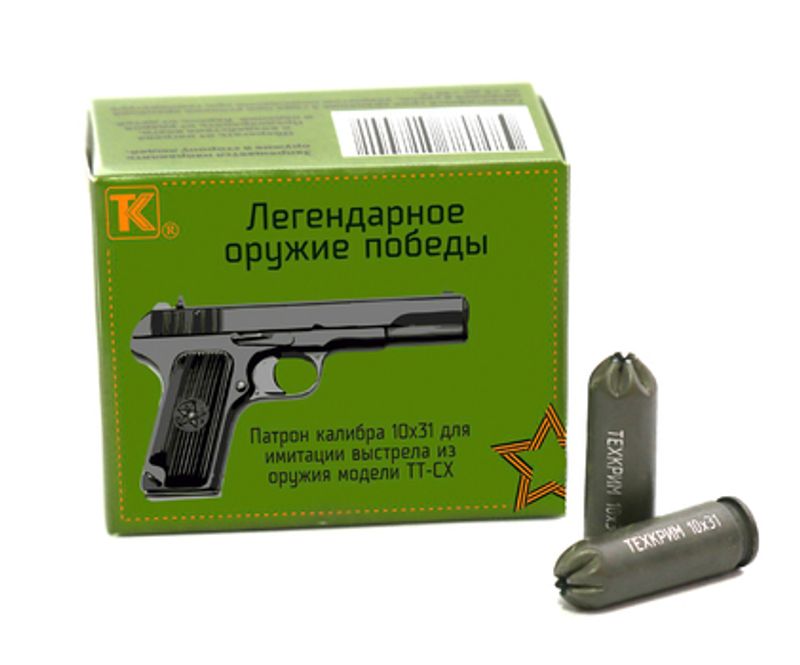 Патроны холостые калибра 10х31 мм (светозвуковые), пачка 20 штук. Подходят для охолощенного пистолета ТТ, Ярыгина, охолощенного пистолета-пулемета ППШ и других образцов оружия СХП соответствующего калибра. Производство "Техкрим" г. Ижевск