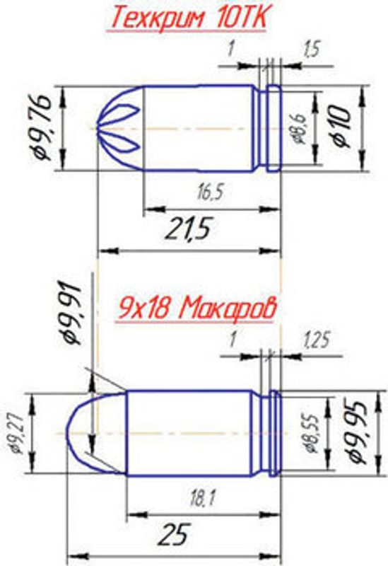 Холостой патрон 10ТК имеет точные габаритные размеры 9,8 мм в диаметре и 21,5 мм в длину