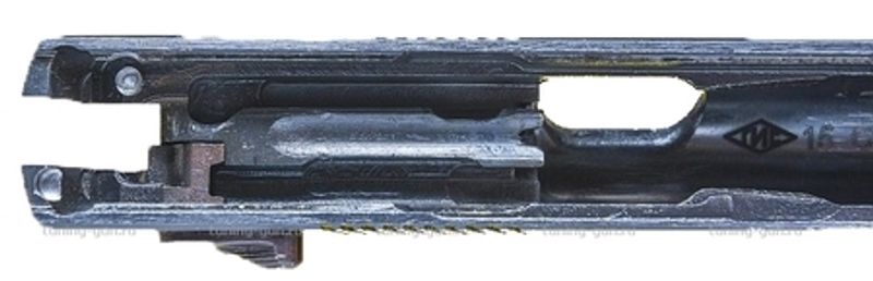 - в задней части затвора установлен штифт, на правой направляющей рамки сделан ответный паз под него. Левая направляющая осталась нетронутой