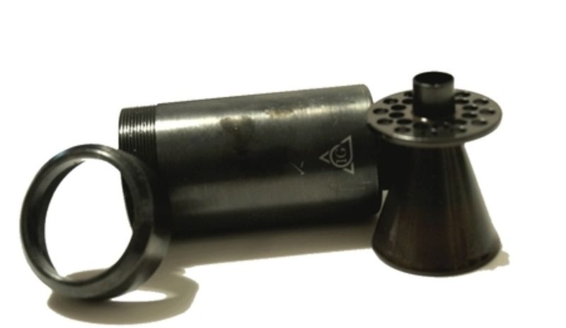 Разборная камера с воронкой внутри, на воронке центрирующий диск с отверстиями, воронка узкой частью направлена к дульному срезу, пуля входит в узкую часть воронки. Пороховые газы в момент выстрела заполняют пространство между воронкой и корпусом пламегасителя, затем рассеиваются, проходя через перфорированный центрирующий диск, от чего падает температура и скорость расширения газов. Находясь в этом пространстве пороховые газы догорают, пламя наружу практически не прорывается.