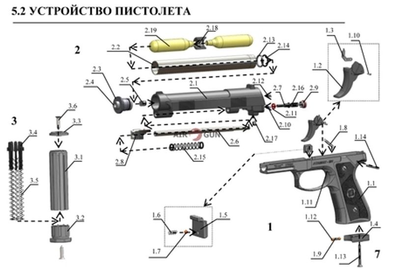- резервуар для газа на 60 куб.см дает возможность использовать два баллона СО2 по 12 г, которых хватает на полный магазин (если необходимо зарядить пистолет одним баллоном, вторым можно поставить пустой)