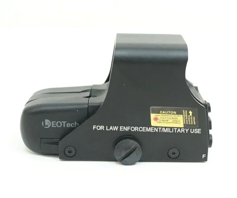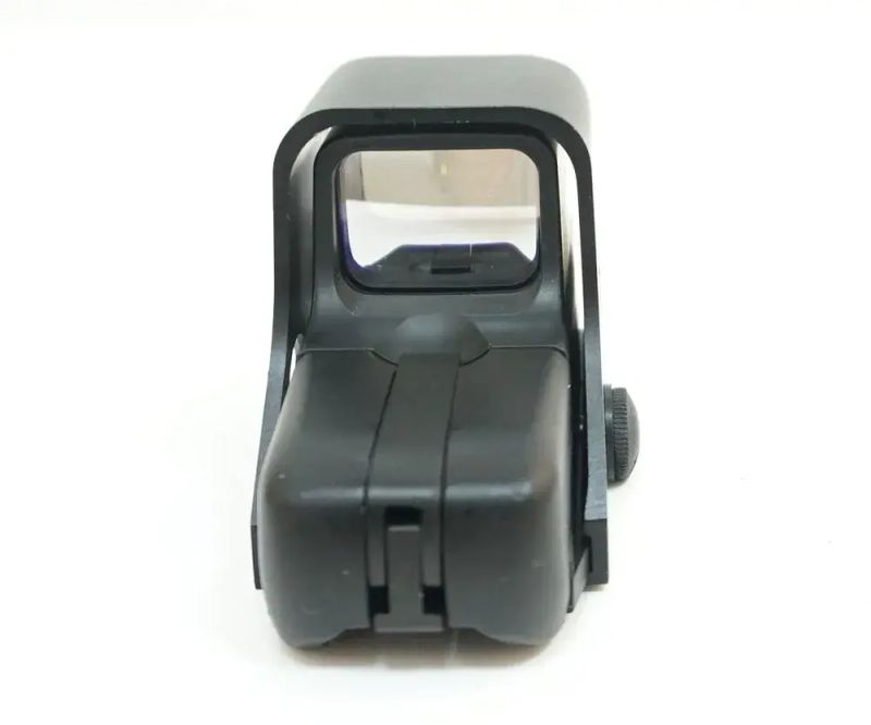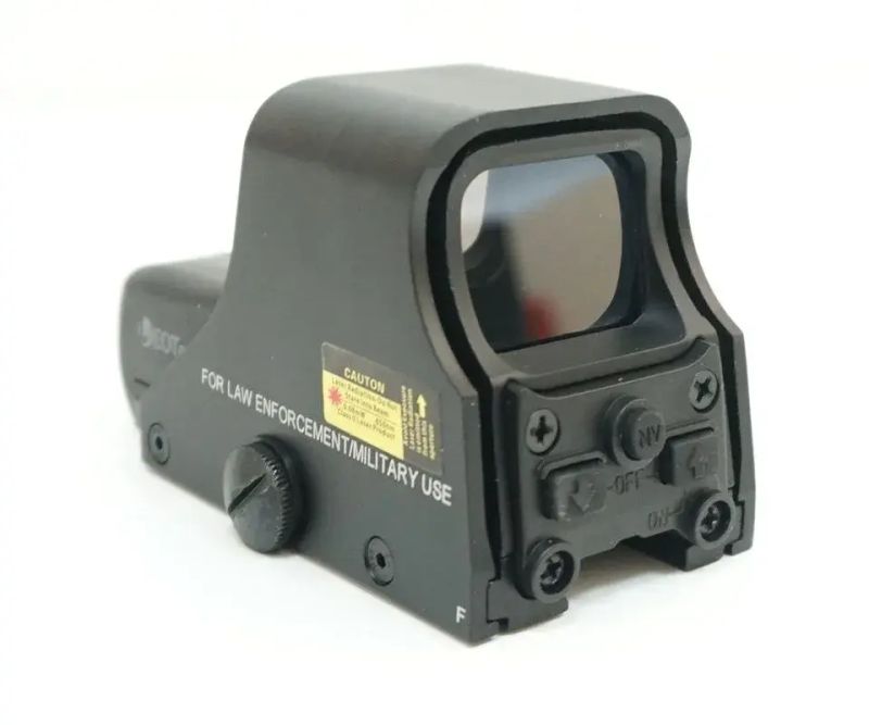 Реплика коллиматорного прицела Eotech 551, это не плохой коллимторный прицел, который можно установить на страйкбольное или пневматическое оружие небольшой мощности. Внешне реплика выглядит очень достойно, почти не отличаясь от оригинала, для тех кому важен антураж это придется по вкусу. Прицельная марка коллиматора имеет 2 цвета и 10 уровней яркости, кнопками вверх-вниз можно настроить нужную яркость. Питание прицела происходит от 4-х батареек типа LR44x4, расположенных в отсеке впереди.