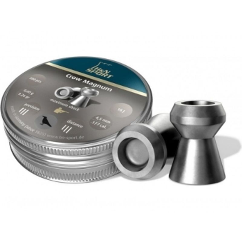Пули H&N Crow Magnum 4,5 мм 0,6 г - очень эффективные экспансивные в калибре 4,5 мм, предназначенные для охоты на малую дистанцию (до 40 метров). Благодаря большой рабочей полости, пуля прекрасно раскрывается при попадании в цель, но кончик такой формы отрицательно сказался на аэродинамике пули, в следствии чего кучность удовлетворительная. Данные пули предназначены в основном для пневматических винтовок с дульной энергетикой порядка 16-25 джоулей. Пули H&N Crow Magnum 4,5 мм 0,6 г - это выбор настоящего охотника, которому важно высокое останавливающие действие пуль.