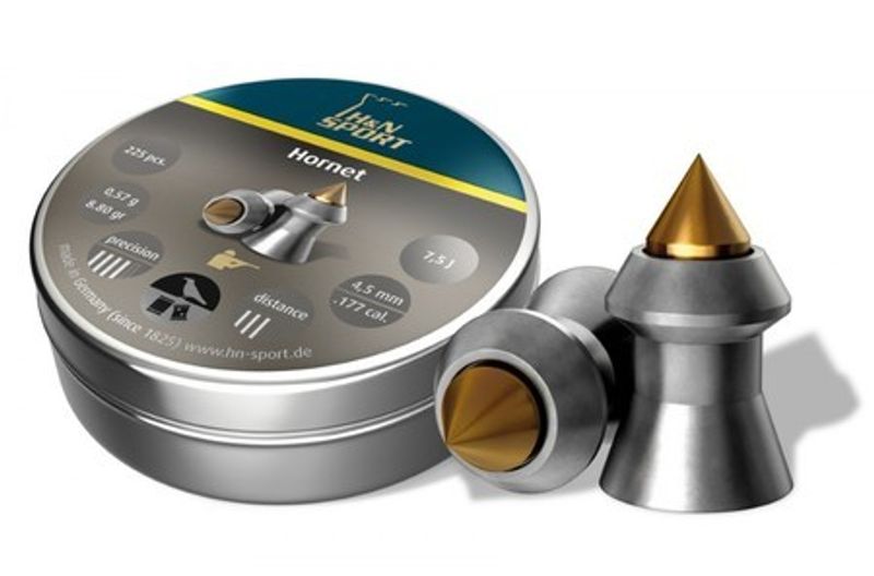 Пули H&N Hornet 4,5 мм 0,57 г - крайне интересные пули, напоминающие пули H&N Red Scorpion, отличаясь от последних наконечником, который теперь не пластиковый, а латунный. Новый более твердый баллистический наконечник позволяет улучшить пробиваемость, по сравнению обычными свинцовыми пулями. Но из-за остроты кончика возможно ухудшение кучности, поэтому точная стрельба данными пулями затруднительна. В аналогичных пулях RWS Power Ball этот недостаток устранен путем закругления кончика пули. Пули H&N Hornet 4,5 мм 0,57 г - неплохие пули, пригодные для развлекательный стрельбы по предметам, которые затруднительно пробить обычными свинцовыми пулями.